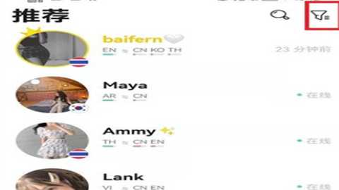 2、在推荐列表中可直接选择感兴趣的外国用户发起聊天。若希望更精准地筛选语伴,点击右上角筛选图标进入高级设置;