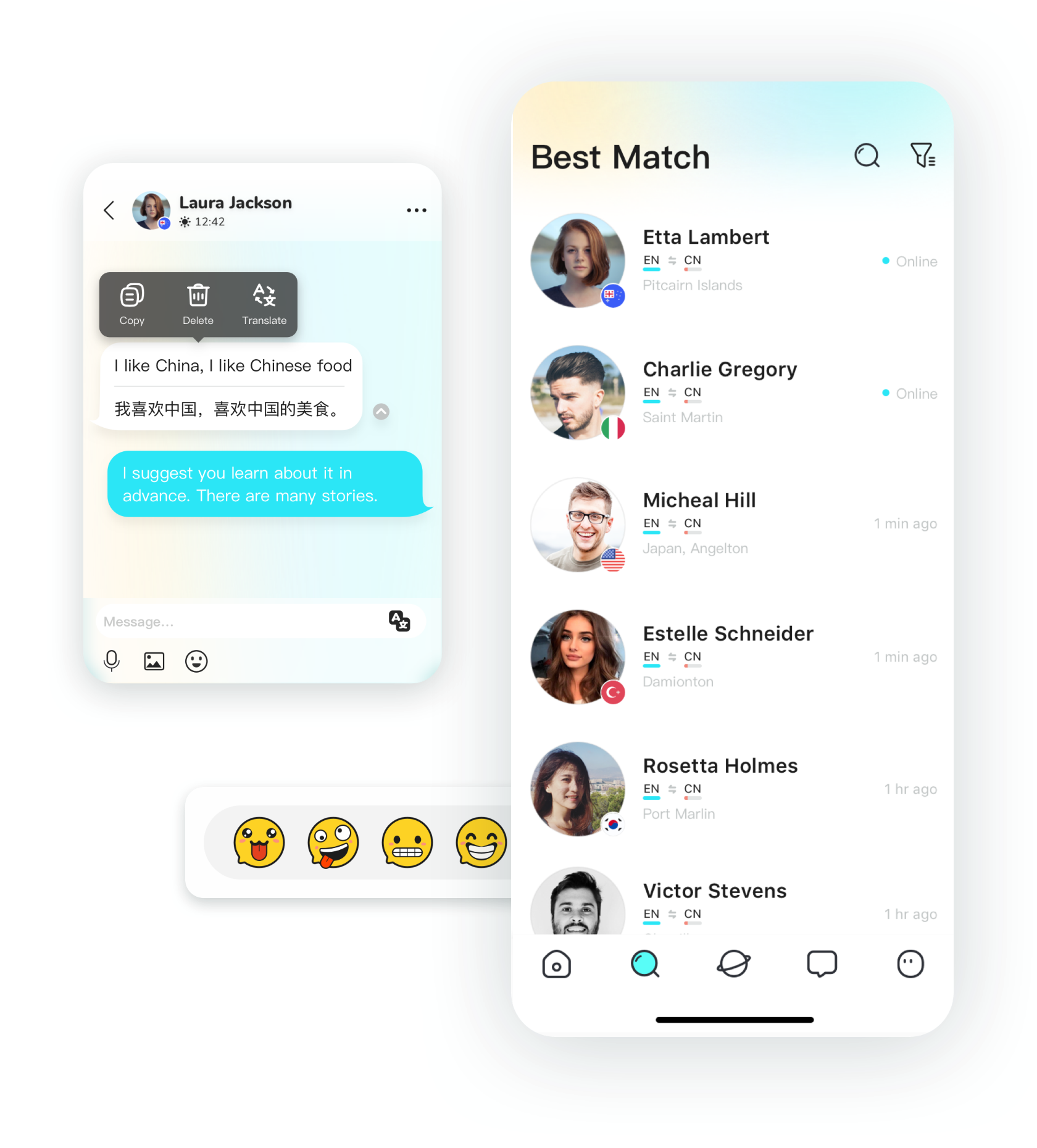2、系统根据国籍、语言、兴趣自动推荐最契合的聊天伙伴,配合免费无限制的聊天翻译,让跨语言沟通毫无压力;