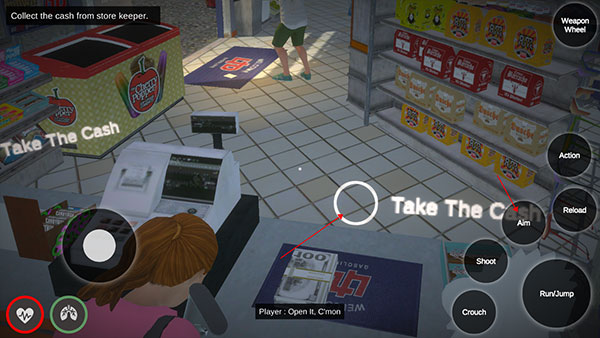 4、然后靠近收银台桌面,点击“Aim”按钮,就会出现白色圆圈,点击“Action”就可以拾取。