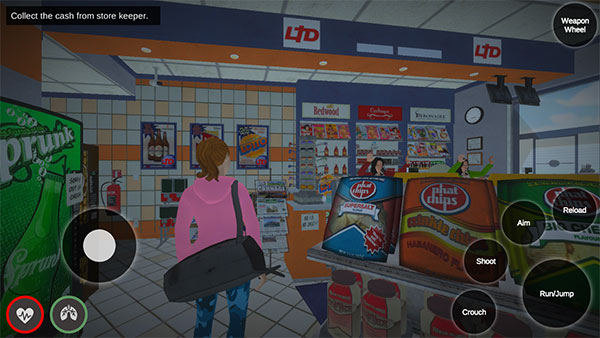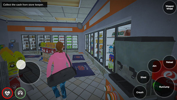 2、左下角按钮可以控制角色自由移动,右侧屏幕滑动调整视野和方向,左上角是当前的任务,需要在超市内收集钞票。