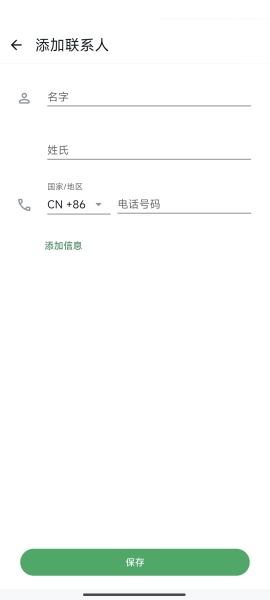 3、在添加联系人界面中,输入联系人的名字和姓氏,在输入手机号码,点击保存就可以成功添加好友。