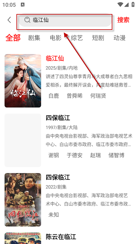 2、也可以在搜索框输入关键词搜索影片。找到影片后,点击播放即可,若播放遇到问题,可尝试刷新或换源。