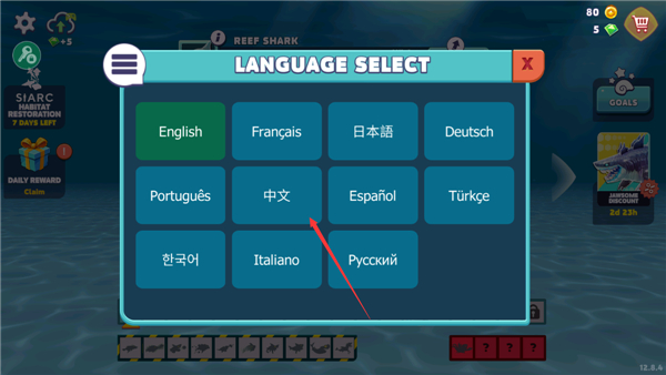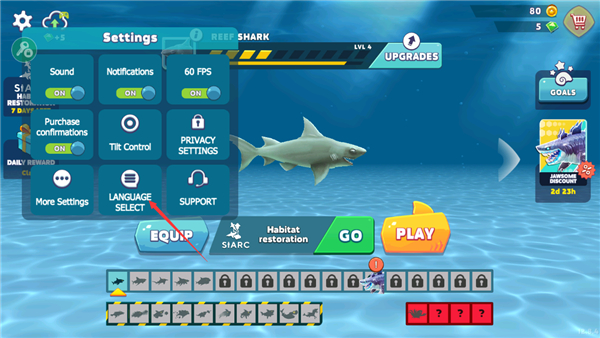 鲨鱼在游戏中获得的金币提升鲨鱼的速度、撕咬范围和饥饿值等各项指标