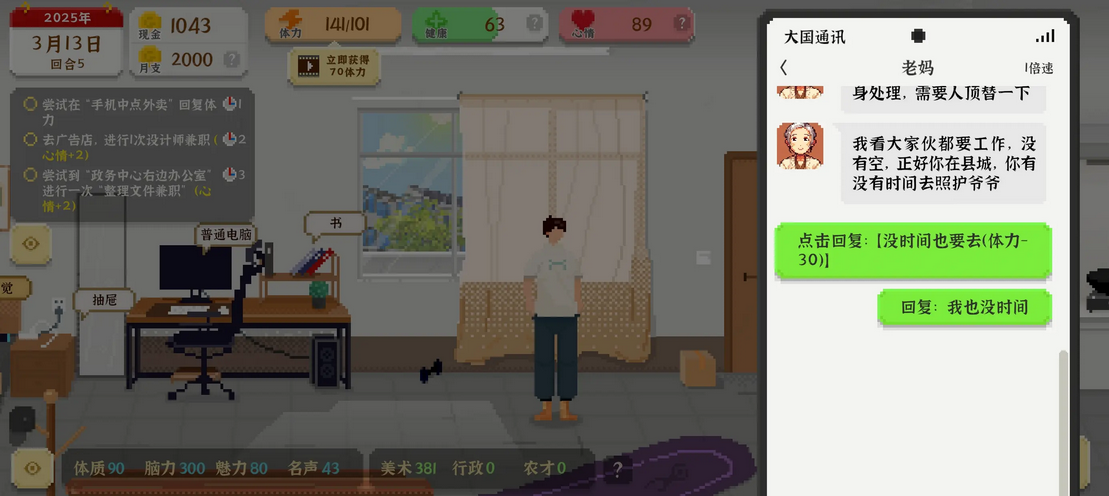 照顾爷爷:-30体+15心情+10名气,自己取舍,这里我选择去。