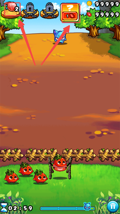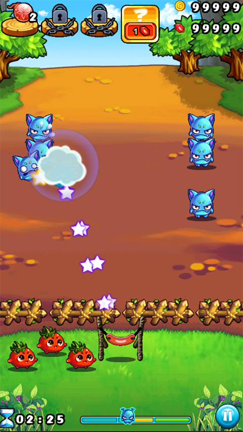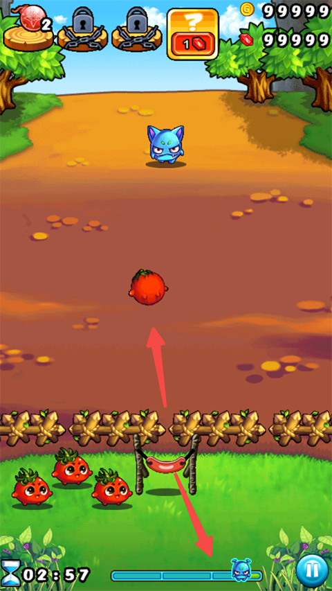 1、玩家进入游戏后可以通过操作下方弹弓来控制蔬菜出击,玩下拉弹弓松手蔬菜就可以飞出去啦!