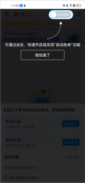6、可通过界面的右上方快速开启或关闭【自动抢单】功能