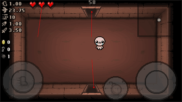 2、左边控制方向,右边控制攻击,左上角红心是你的命数,前往门前进入另一个房间开始战斗。