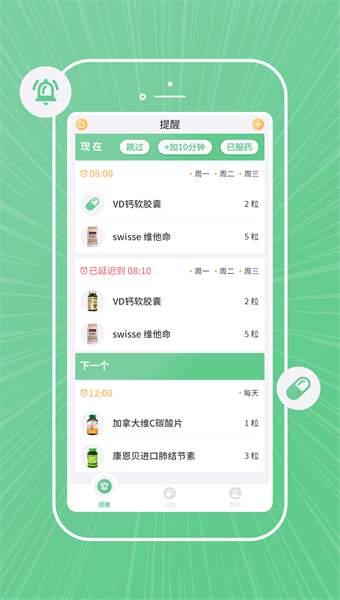 5、设定自己的用药方案,每日准时提醒用户们用药,产生准时用药的习惯。