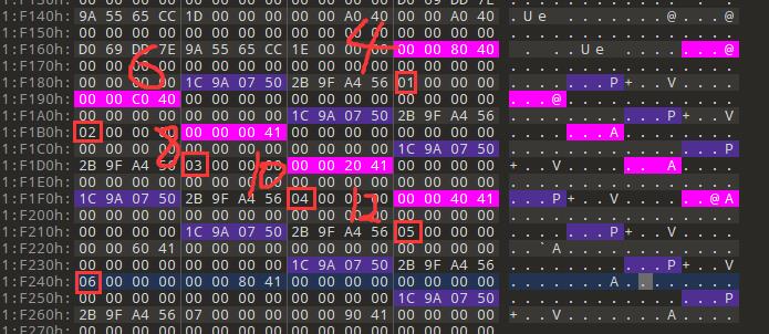 然后观察数据结构,结构其实非常清晰易懂,如下图,紫色标记是攻击力的词条代码,红框是词条等级,粉色标记(浮点数)是该等级的加成值,从1级开始依次是+4,+6,+8,+10,+12等等。然后根据你的需求修改数值即可。