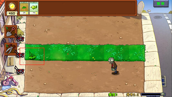 5、先叠种三次的豌豆根,可攻击三条路线,叠种根会额外消耗25阳光。