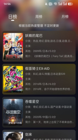 2、在APP中,你还可以看到相关的日榜、周榜、月榜,让你轻松了解最热门的动漫。