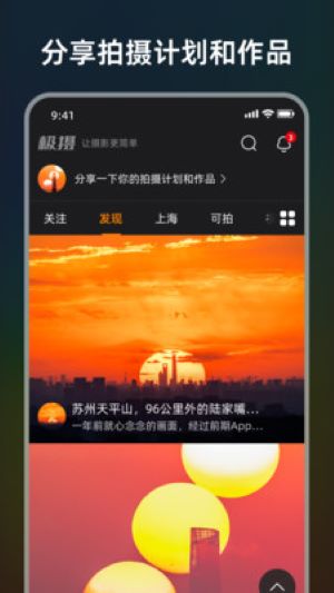 1、打开APP,在“分享拍摄计划和作品”页面中,你可以轻松上传摄影计划与作品,和社区里的朋友们一同交流灵感。