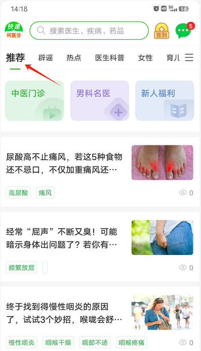 1、点击推荐界面,设有搜索栏,涵盖中医门诊等板块,呈现高尿酸等健康科普文章。