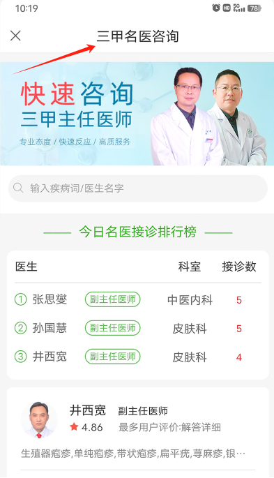 3、点击三甲名医咨询页,可快速咨询三甲主任医师,展示当日名医接诊排行榜及医生擅长病症。
