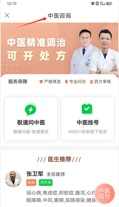 2、点击中医咨询页面,主打中医精准调治,有极速问中医和中医挂号服务,推荐张卫军医生。