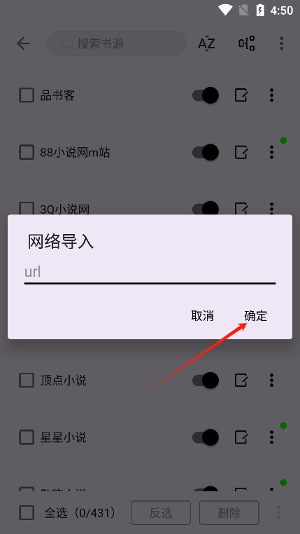 4、最后输入要导入的书源地址并点击“确认”即可。