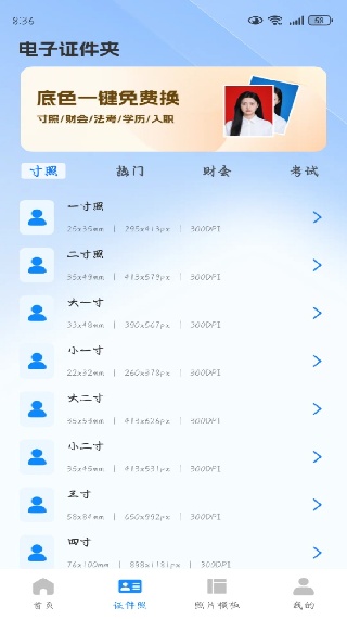 2、进入首页以后选择证件照板块,就可以看到多种不同规格;