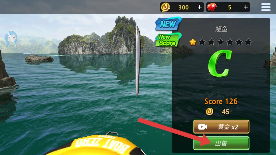 4、成功钓到鱼后,查看鱼的评分等信息,若想换取金币,点击【出售】按钮将钓到的鱼出售。