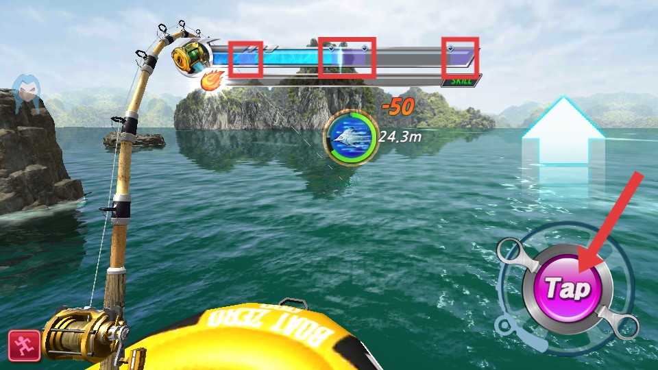 3、钓鱼过程中,点击【Tap】按钮将能量条控制在【红框】内,当【鱼】的能量耗尽时即可将鱼钓起。