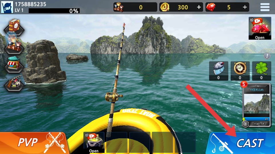 1、进入游戏界面,点击【CAST】按钮抛竿钓鱼。