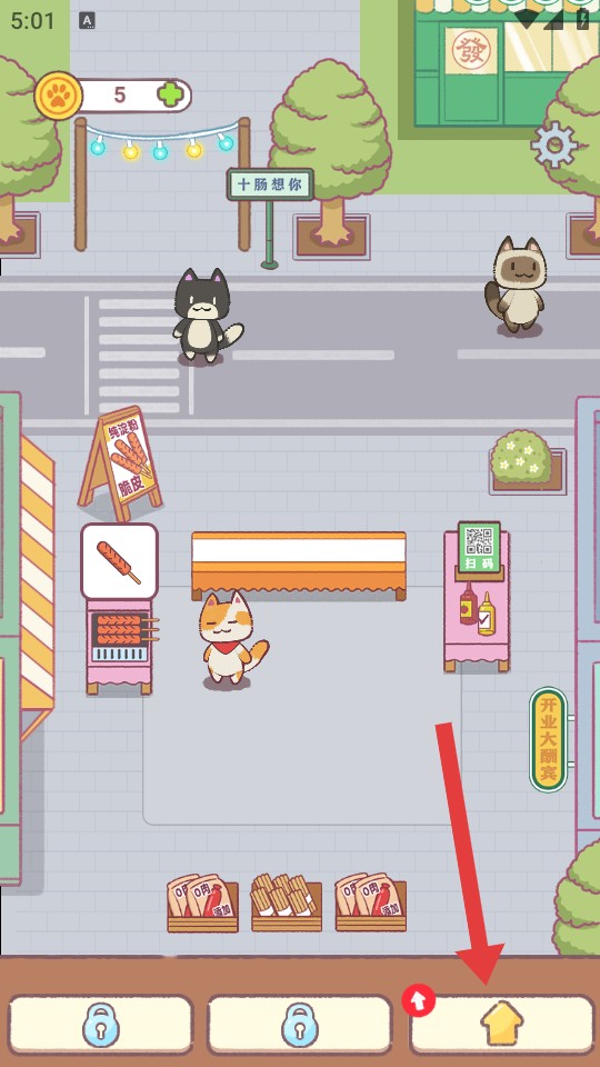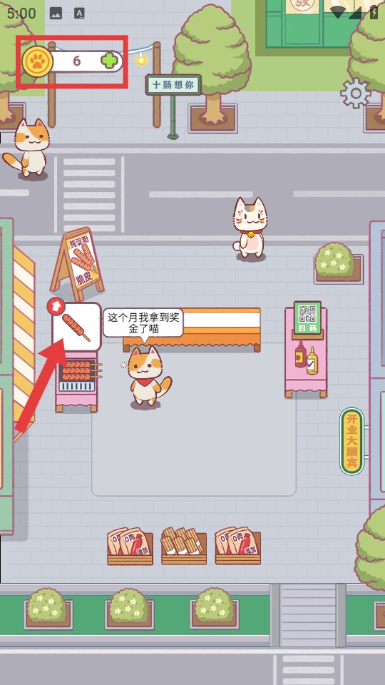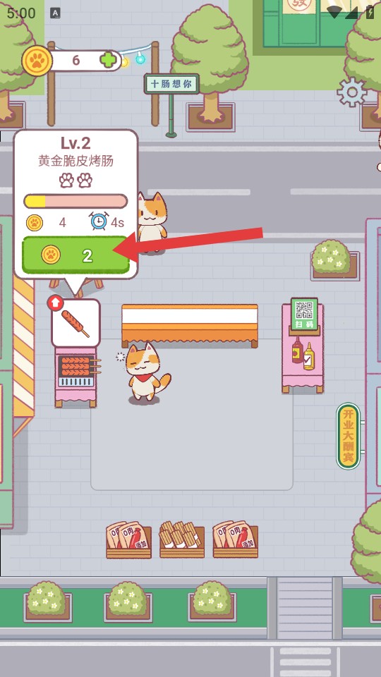 1、进入游戏界面,先留意红框内的金币数量【6】,然后点击红箭头所指的【烤肠摊位】。