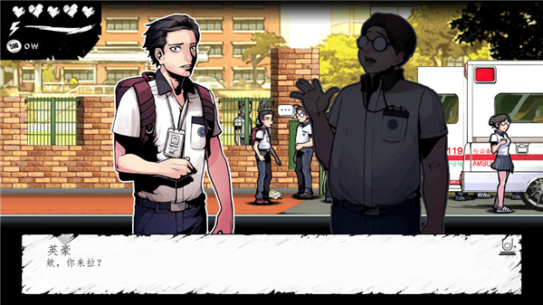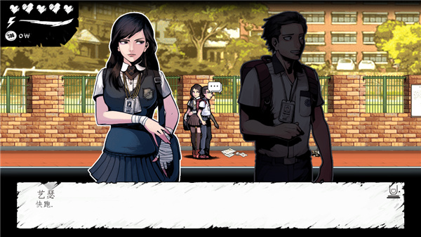 见到宋老师疯狂般地拿刀攻击而来,不知这到底发生了何事,当然要先顾生命。赶快往右快跑到尽头进男厕所,躲在最后一间厕所里。(你的血量就是左上的五颗心,全灭就Game Over!)