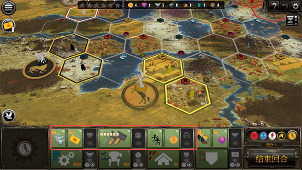 4、游戏的规则和流程相当简单,每回合玩家们轮流选择行动面板上的4个行动区域之一(不可与上一回合行动相同),执行顶部行动与底部行动。所有的行动图标都简洁明了,红色图标为花费,绿色图标为收益。