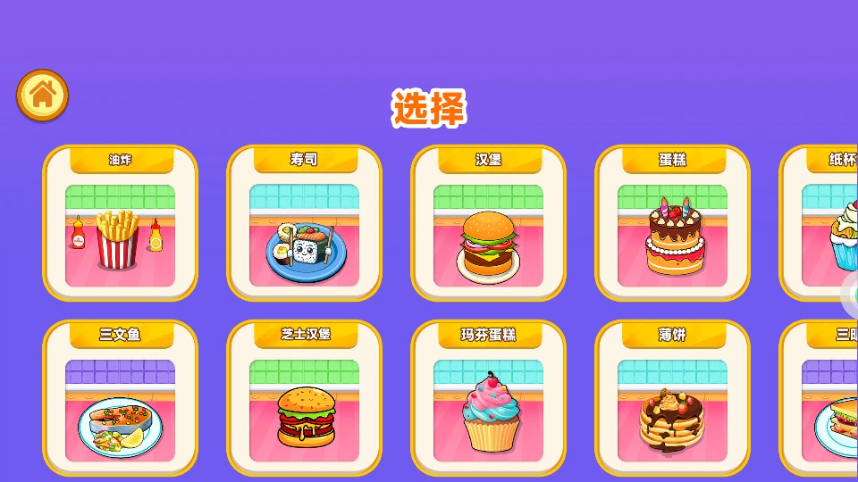 2、在美食选择界面,从【油炸】【寿司】【汉堡】等分类里,挑选想要制作的美食类型。