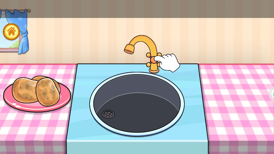 4、点击水龙头,用水清洗挑选好的土豆,完成食材清洗步骤,为后续美食制作做准备。