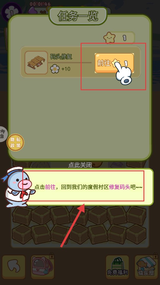 4、在【任务一览】中选【码头修复】任务,需收集【+10-花朵】,点击【前往】修复。