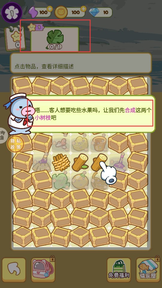 3、按指引合成两个【小树枝】,可点击物品看描述,推进【树叶】任务进度。