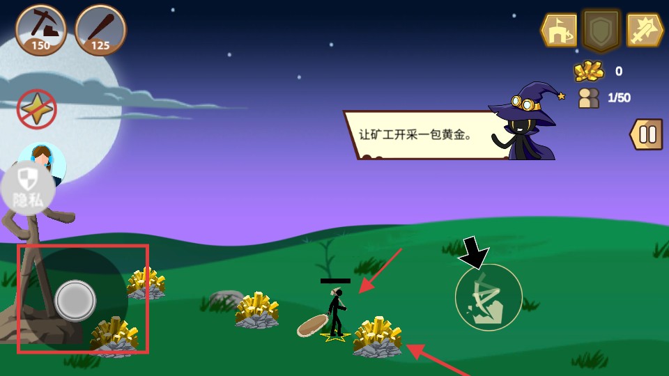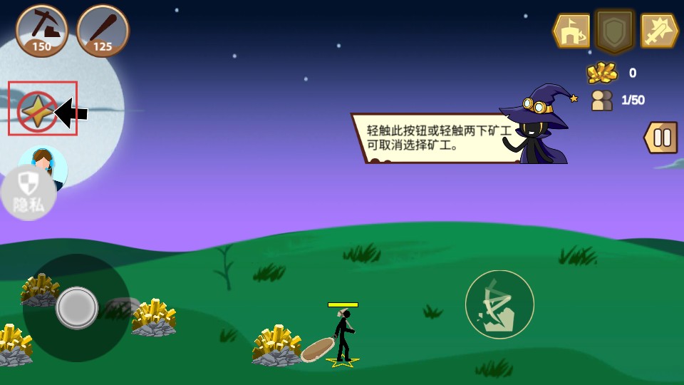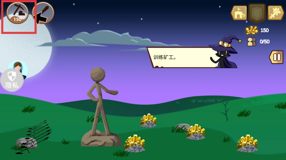 2、在游戏场景中,点击左上角显示【150】的矿工图标,召唤矿工。