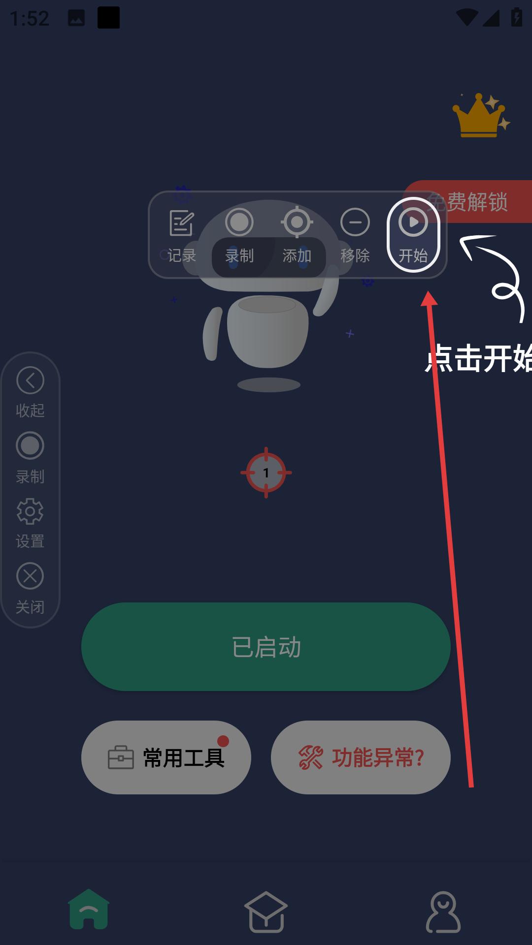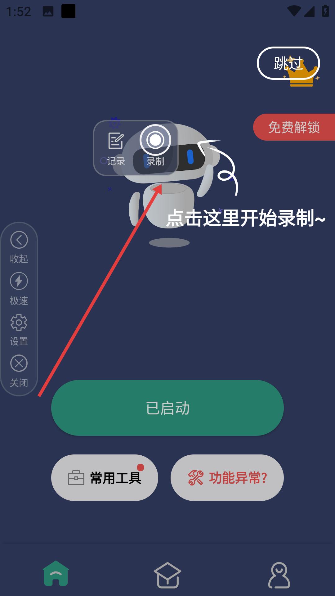 3、在APP录制功能页面,按照提示点击对应位置可开始录制,同时还有常用工具等功能入口,方便用户进行各类操作。