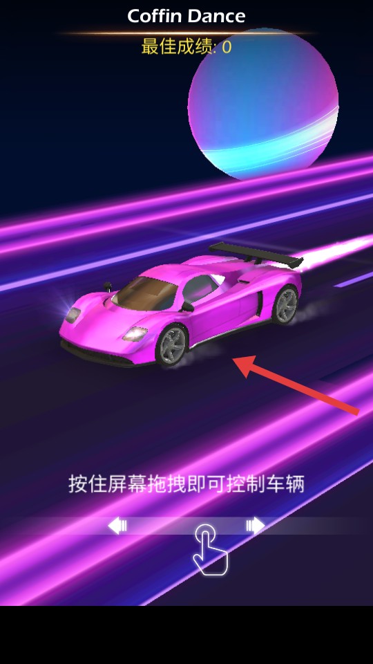 1、按住屏幕拖拽控制粉色赛车,开启游戏挑战。