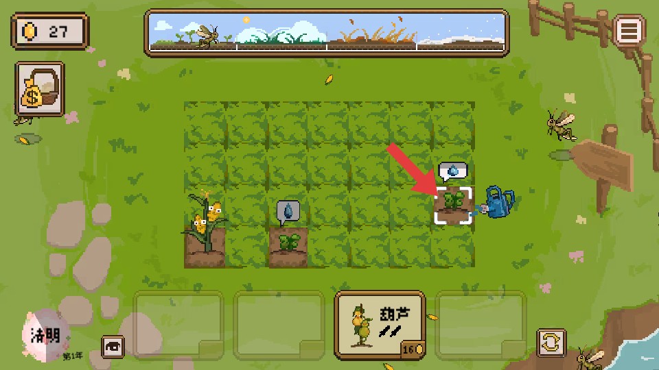 4、种植后,关注作物生长情况,长按箭头所指位置,对作物进行浇水养护。