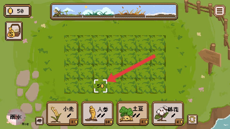 2、留意左上角【50】金币数量,长按地块,花费对应金币进行开垦准备种植。