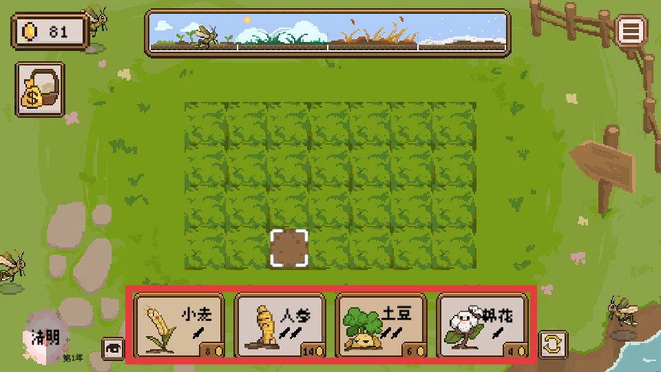 3、查看下方红框内的【小麦】【人参】【土豆】【棉花】等作物,选择想种植的作物进行播种。