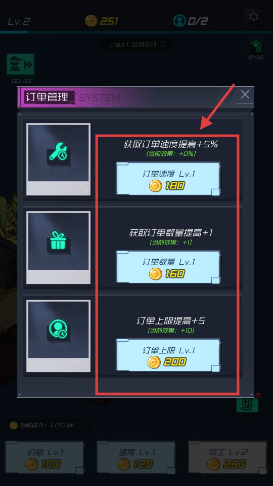 4、进入“订单管理”界面,消耗金币升级“订单速度”“订单数量”“订单上限”,优化订单相关能力。
