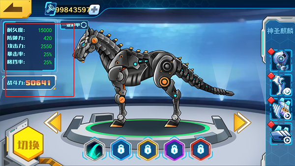 2、在机甲仓库中可解锁各种不同的机甲,在左侧还会显示属性和战斗力。