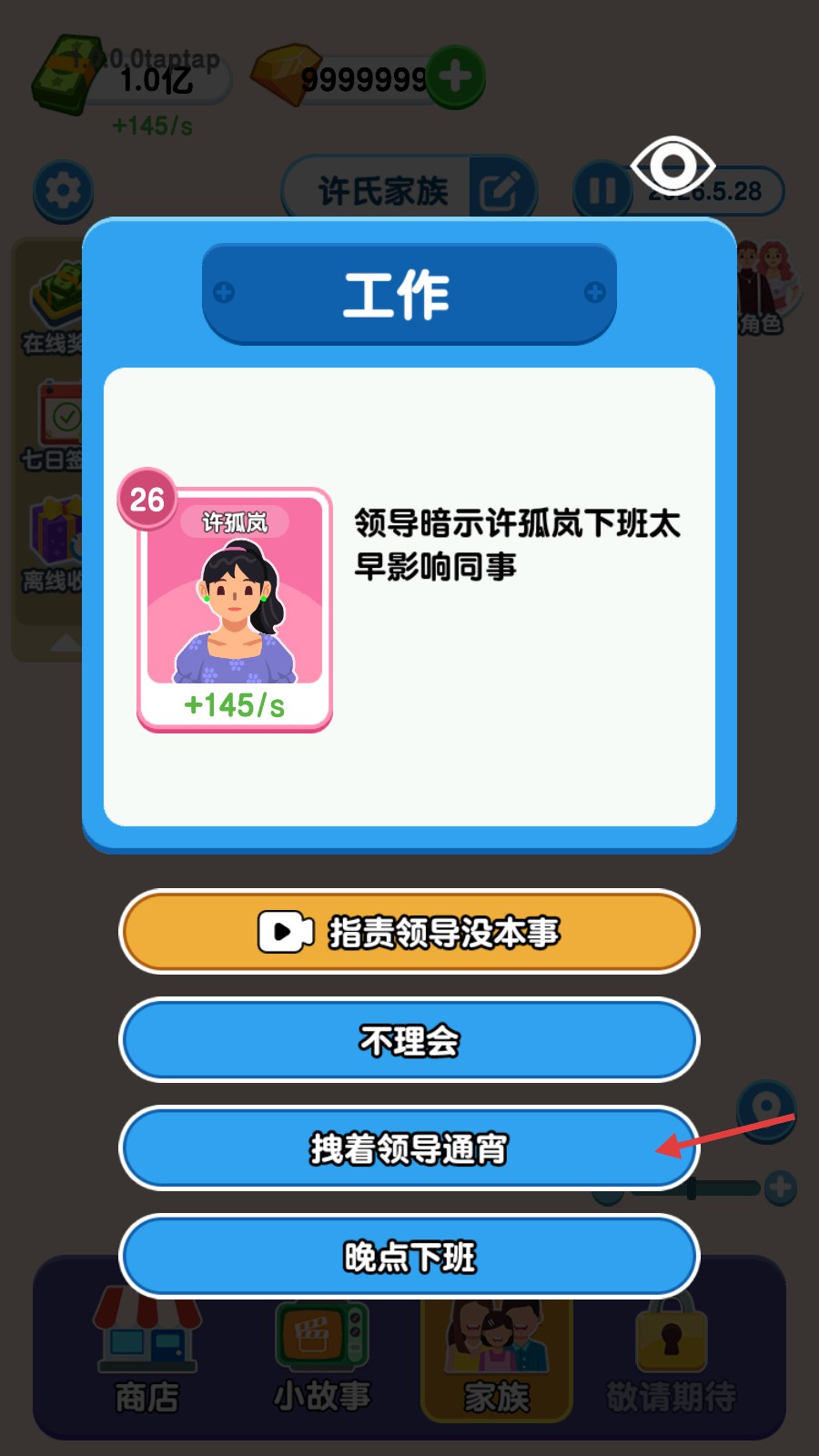 1、我们在工作事件中,面对领导暗示下班早的情况,选择【拽着领导通宵】,看看后续发展。