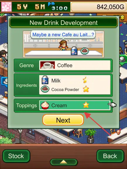 2、研发新饮:选咖啡genre,添加牛奶、可可粉等原料,配奶油topping,点【Next】开发新品。