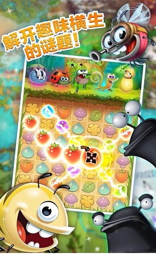 游戏以卡通风格制作,我们将进入一个神奇的怪物世界,这里有各种各样奇特的生物,它们其貌不扬,但是却有着自己的独特能力。游戏采用竖版2D画面呈现,下半部分是消除的方格,上半部分则是怪异生物所生存的丛林,我们要通过消除下面的水果和植物来完成攻击。游戏中色彩非常鲜艳,画面质量也很不过,一些细节上的描绘非常精致,虽然没有真实的感觉,但是却能感受到精彩的消除过程。