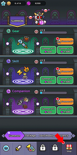 2、装备可以点击右下角进入商店界面,第一个池子就是装备池,第二个则是技能池,第三个为宠物池,大家根据需要抽取即可