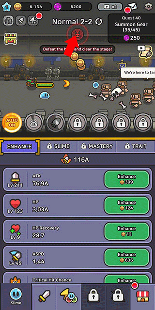 2、消耗金币以升级技能、强化角色装备,让史莱姆更加强大。
