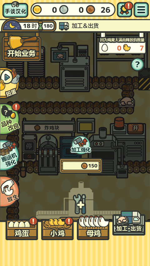 而夜晚,则是升级机器,开扩新的流水线和食品机器,改良鸡种的时候了,你还可以主动看广告获得一笔算是丰富的资助金。