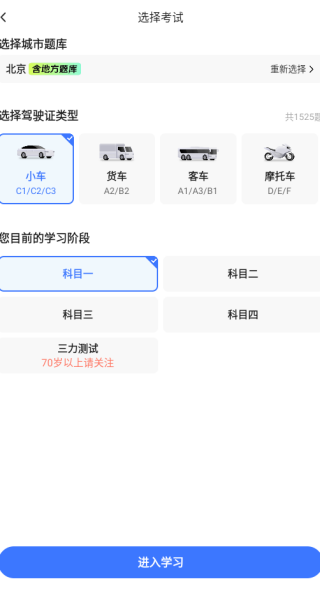 3、注册好了就可以进入备考界面,用户可以选择你的城市和考试科目。