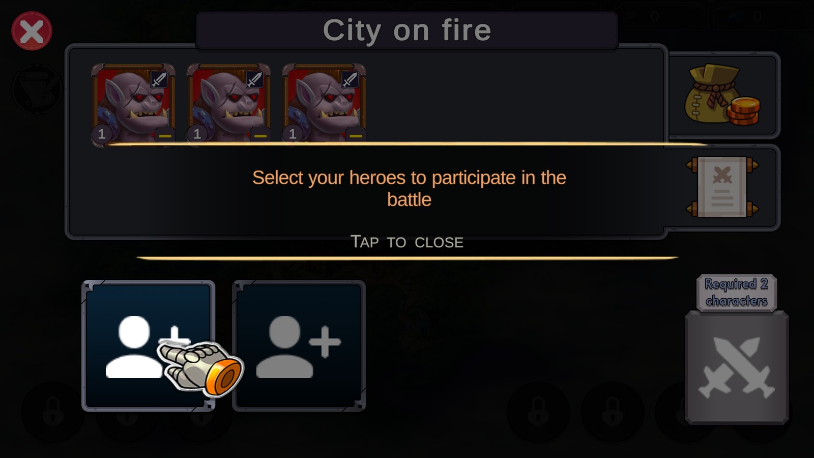 4、进入战斗环节,依据提示,选择至少2名英雄参与战斗。