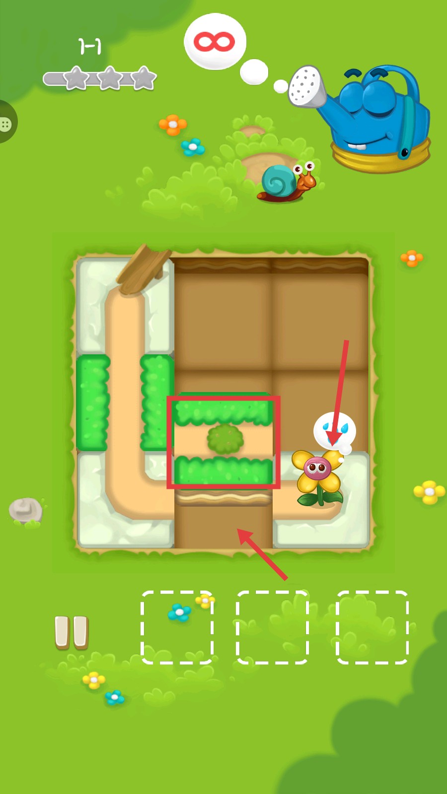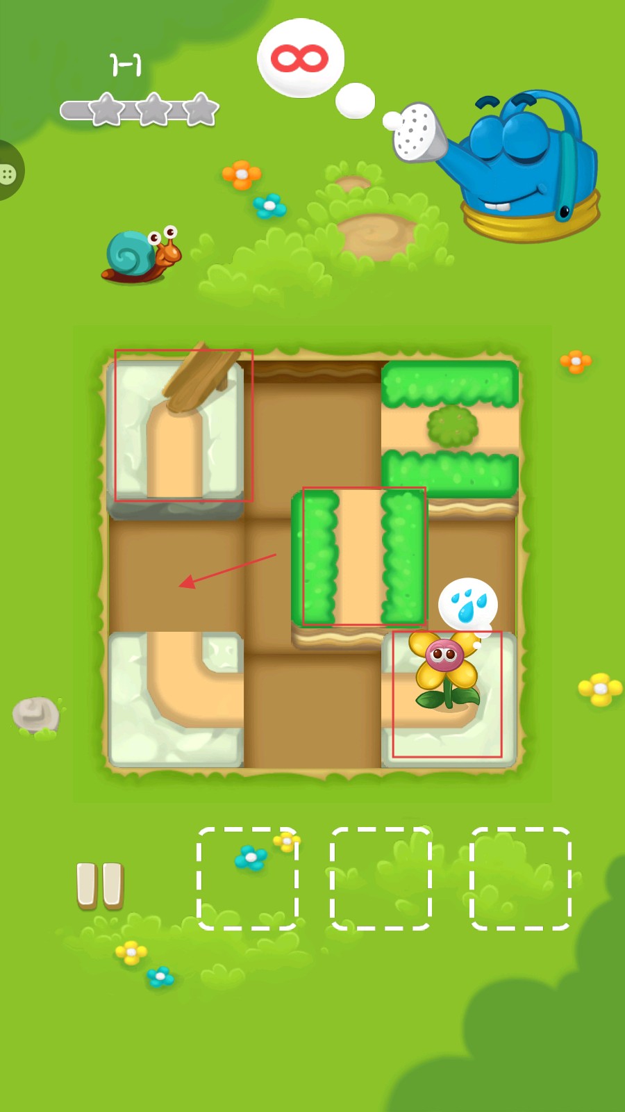 2、在游戏场景内,移动中间的通道模块,规划水流路径,让水流向需要浇灌的花朵方向。