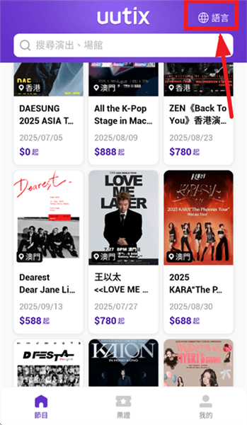 1.打开uutix app,进入节目首页后点击右上角语言按钮