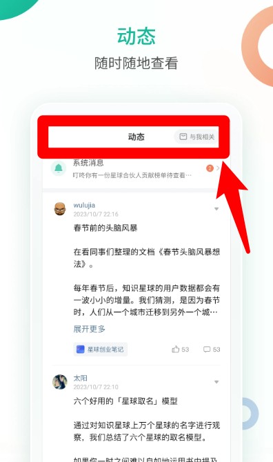 3、点击“动态”标签页,随时查看系统消息或关注用户的最新发布内容,了解社区热点动态。